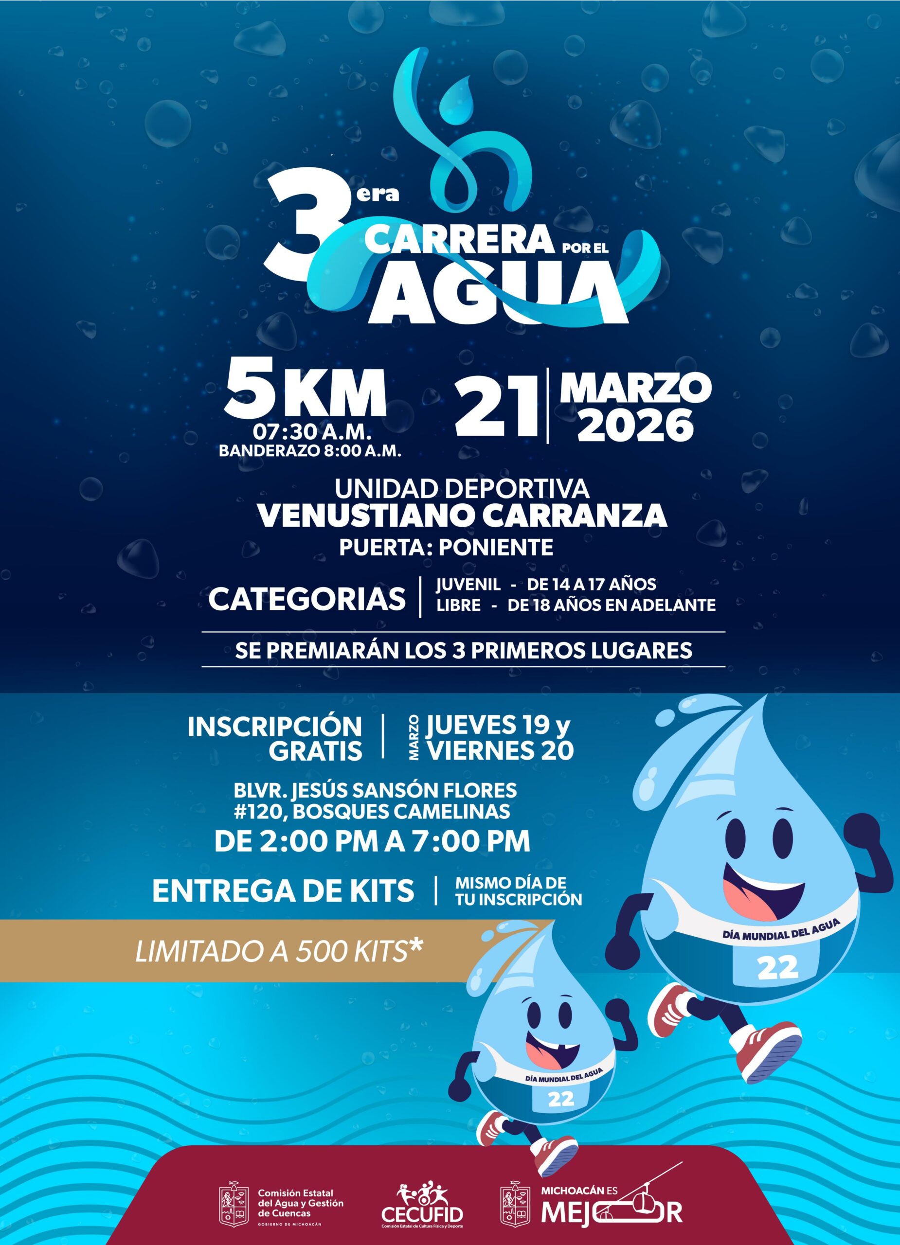 Morelia, Michoacán, 16 de marzo de 2026.- En el marco del Día Mundial del Agua que se conmemora el 22 de marzo, la Comisión Estatal del Agua y Gestión de Cuencas (Ceac), lanzó la convocatoria para la tercera edición de la Carrera por el Agua que se llevará a cabo este sábado 21 de marzo […]