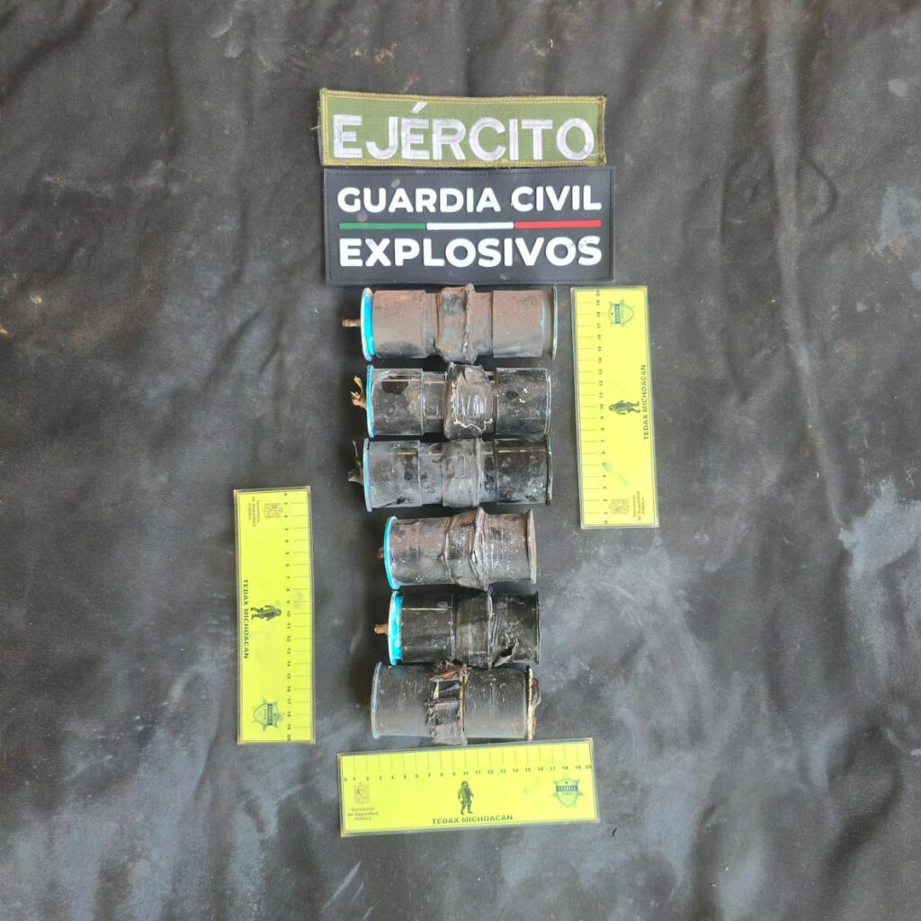 Elementos del Ejército y de la Secretaría de Seguridad Pública de Michoacán desactivaron siete artefactos explosivos improvisados y una granada calibre 40 mm en la comunidad de La Ruana, municipio de Buenavista.