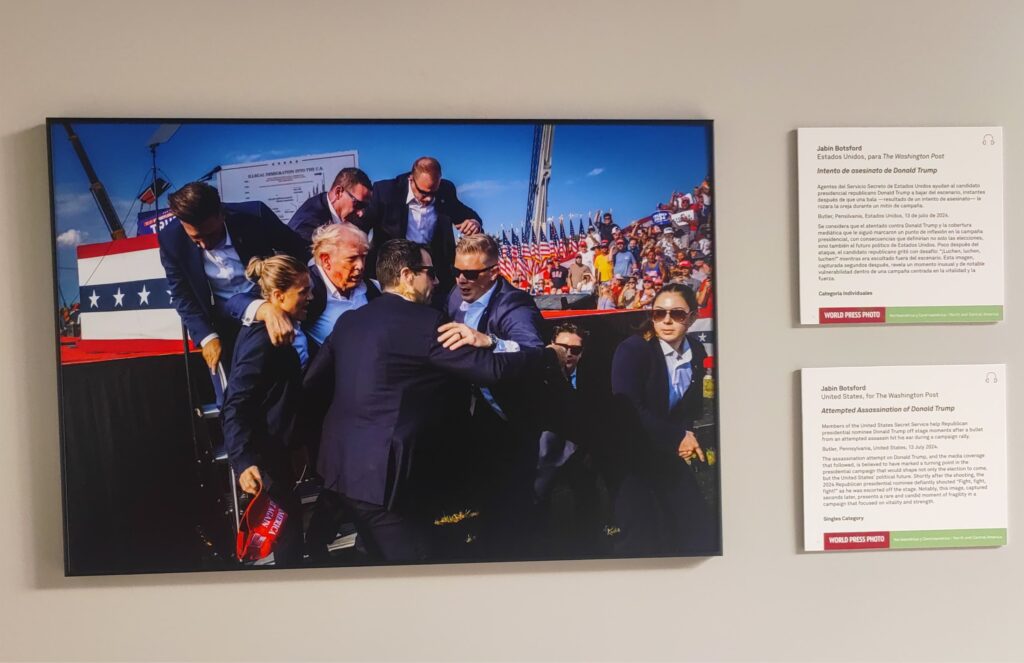 Una de las fotografías más discutidas —y que no se llevó el premio mayor, pero sí se ganó un espacio especial— es la que muestra el intento de asesinato de Donald Trump durante un mitin en Pensilvania. Capturada por Jabin Botsford, fotógrafo de The Washington Post, la imagen congela un instante de vulnerabilidad que contrasta con el discurso de fuerza que ha marcado su carrera política. Es, sin duda, un documento histórico que marcará un antes y un después en la narrativa visual de las campañas en EE.UU.