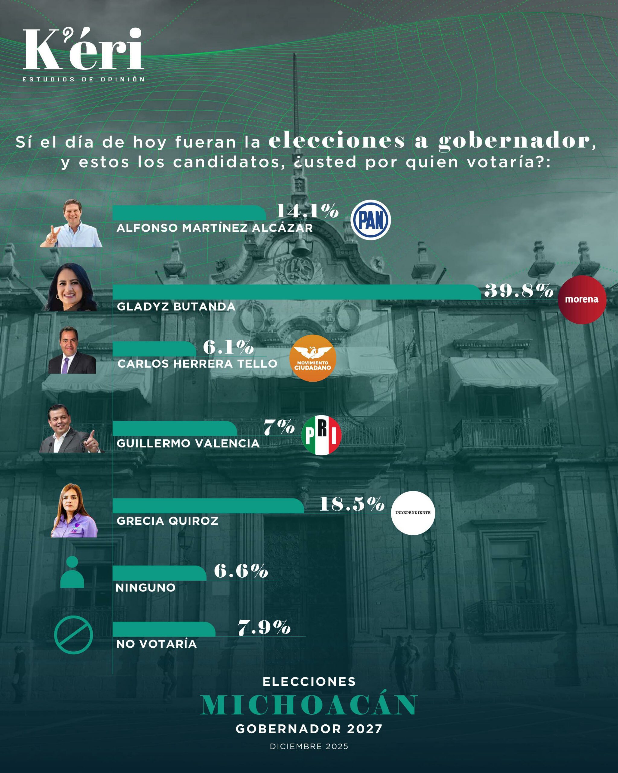 De acuerdo con la encuesta de K’éri, levantada del 26 al 28 de diciembre de 2025, Butanda registra 19.8 por ciento de preferencia en el escenario interno de Morena.