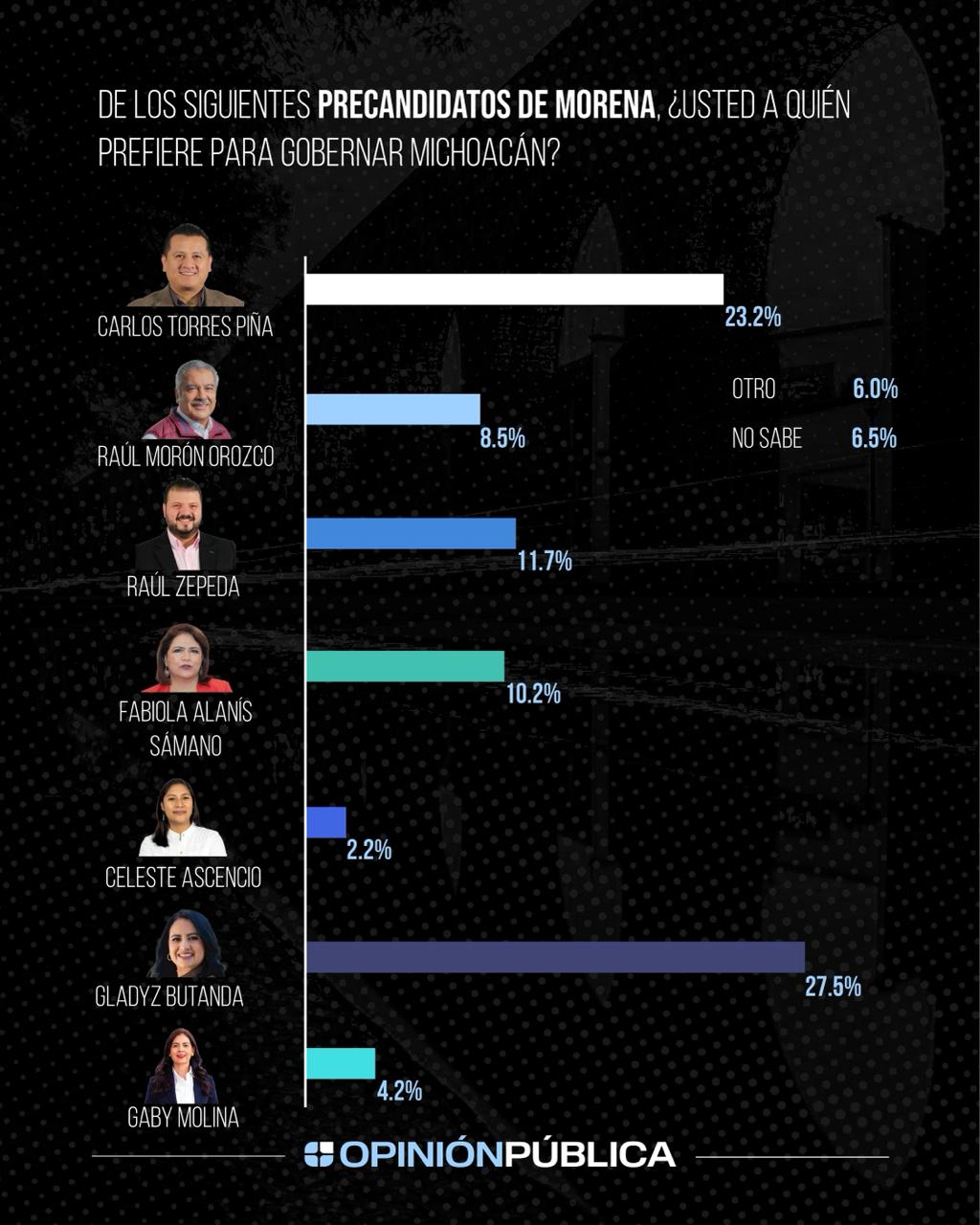 La más reciente medición de la casa encuestadora Opinión Pública perfila a Gladyz Butanda como la aspirante mejor posicionada de Morena para competir por la gubernatura de Michoacán en 2027.