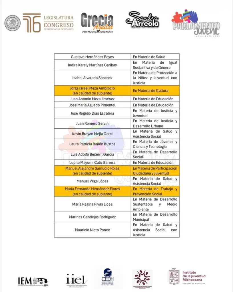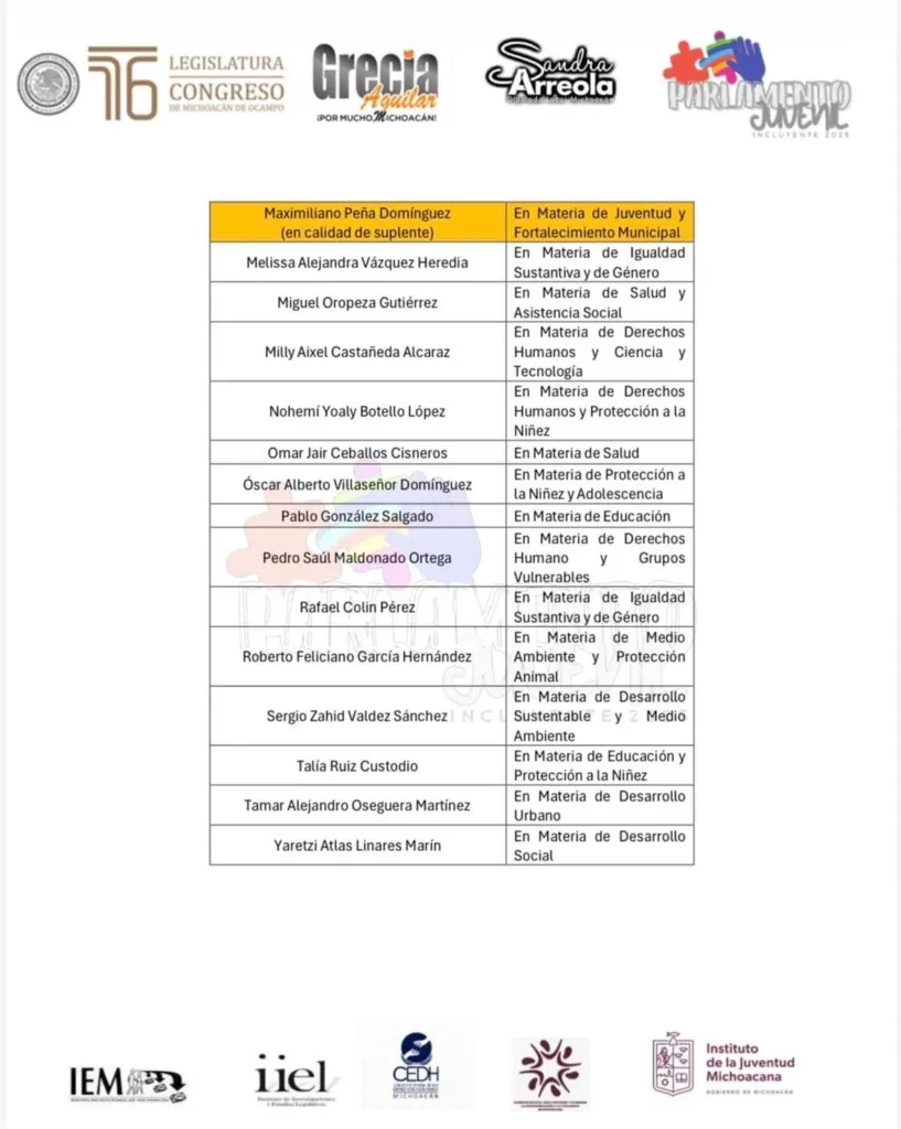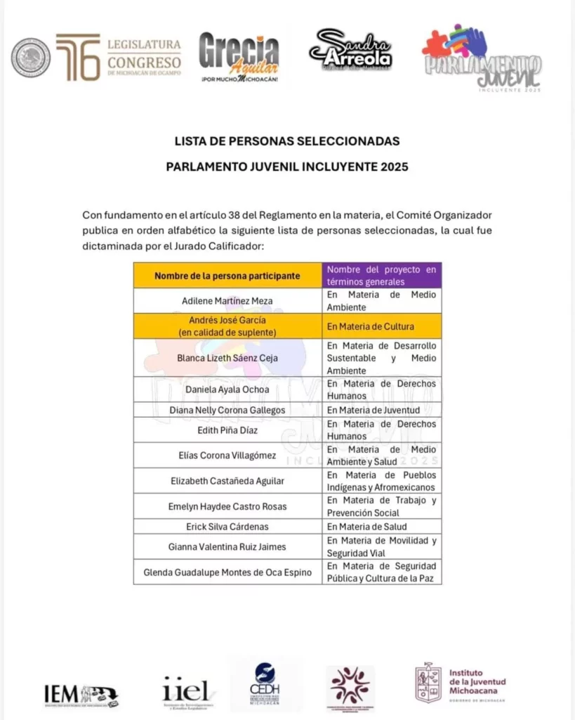 Morelia, Michoacán; a 18 de octubre de 2025.- Tras reconocer la participación de las y los jóvenes, la diputada Grecia Jennifer Aguilar Mercado, presidenta del Comité Organizador del Parlamento Juvenil Incluyente 2025, dio a conocer la lista de las y los seleccionados que formarán parte de este importante ejercicio de participación democrática, incluyente y transformadora.