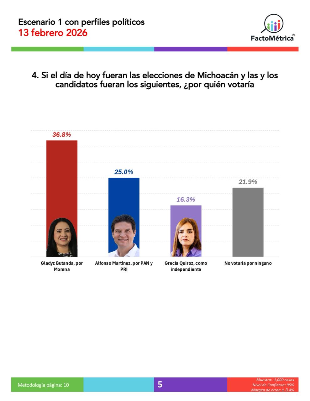 El nuevo sondeo, realizado el 10 y 11 de febrero, coloca a la secretaria de Desarrollo Urbano y Movilidad del estado a la cabeza en su careo, con 36.8 %, superando ampliamente al alcalde de Morelia, Alfonso Martínez, quien registra 25 %, y a la alcaldesa sustituta de Uruapan, Grecia Quiroz, con 16.3 %.