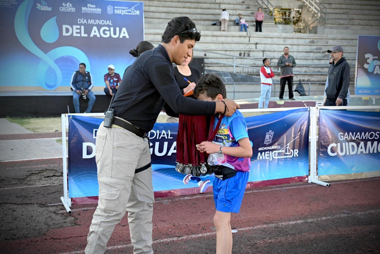 Morelia, Michoacán, 21 de marzo de 2026.- En el marco del Día Mundial del Agua, la Comisión Estatal del Agua y Gestión de Cuencas (Ceac) llevó a cabo la Tercera Carrera Por el Agua, jornada deportiva que reunió a 500 participantes de todas las edades en la Unidad Deportiva Venustiano Carranza.