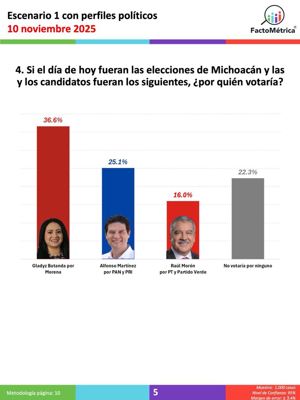 El levantamiento, realizado los días 29 y 30 de octubre de 2025, muestra que la aceptación de la morenista alcanzó 36.6 %, colocándola al frente de las preferencias, seguida por Alfonso Martínez con 25.1 % y Raúl Morón con 16 %.