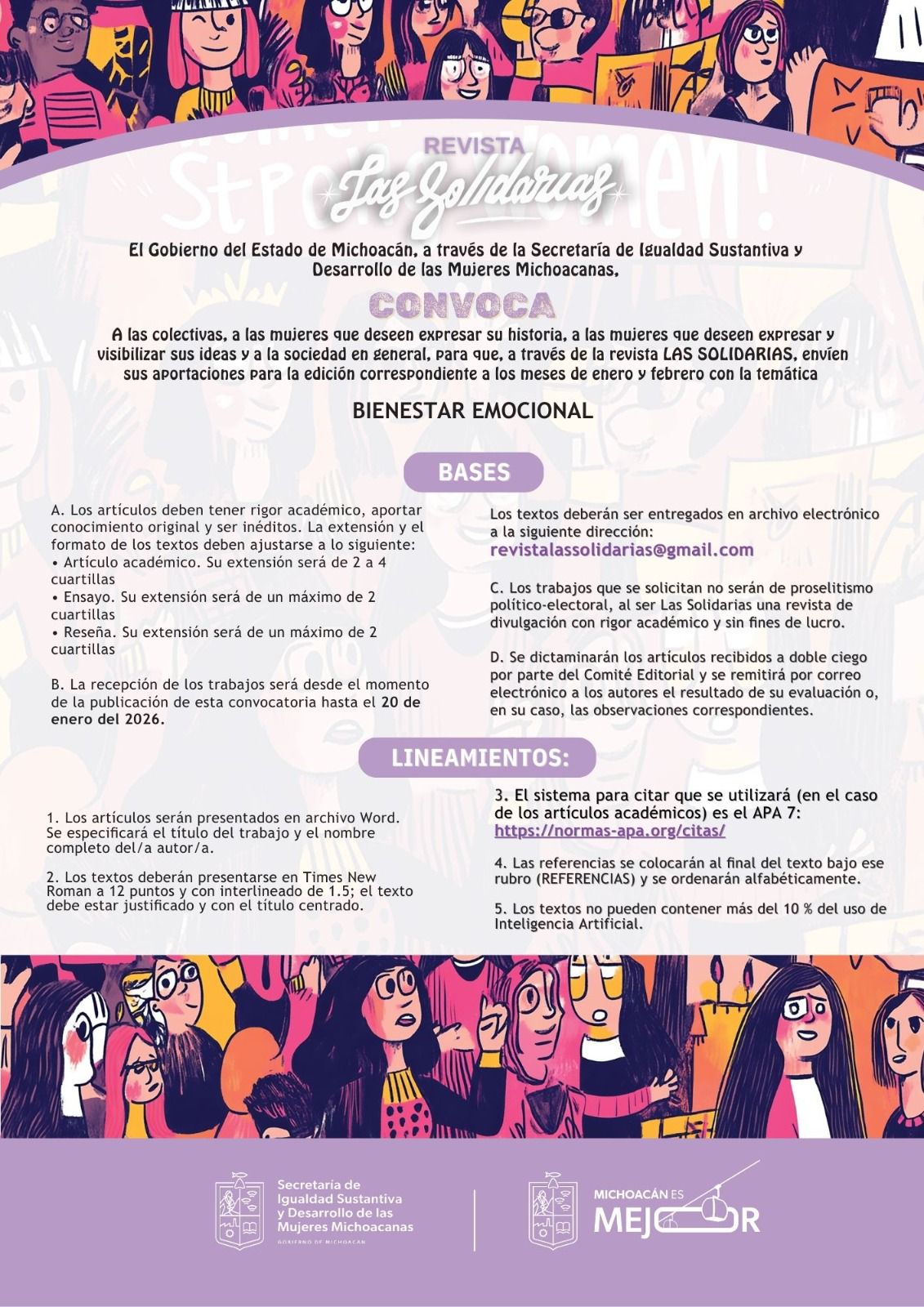 Morelia, Michoacán, 15 de diciembre de 2025.-* La Secretaría de Igualdad Sustantiva y Desarrollo de las Mujeres Michoacanas (Seimujer), encabezada por Alejandra Anguiano González, dio a conocer la convocatoria para participar en la revista Las Solidarias, un espacio editorial impulsado desde el Gobierno del Estado para fortalecer la participación de las mujeres en la construcción de pensamiento, análisis y propuestas para la transformación social.